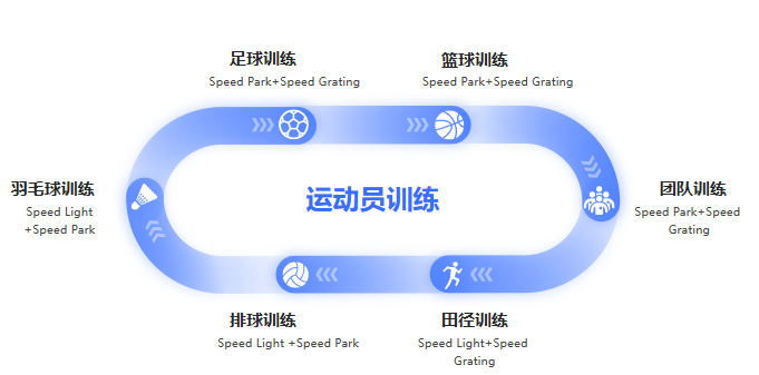 SPEED π 速度灵敏性测试训练系统包含灵敏反应速度训练系统(Speed Park)、上肢灵敏反应速度训练系统(Speed Light)、光栅区间测速系统(Speed Grating)三大组块,各组块间相辅相成,致力于提高运动员专项素质能力。