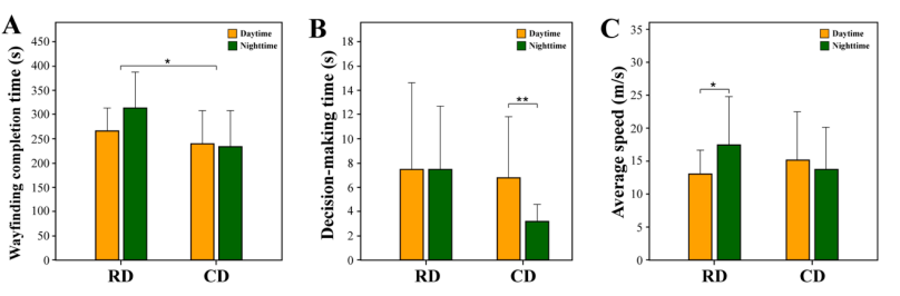 图5 参与者在住宅区和商业区寻路任务中的表现。A为行人完成寻路任务的平均任务完成时间;B为行人完成寻路任务的平均决策时间;C表示行人完成寻路任务的平均速度
